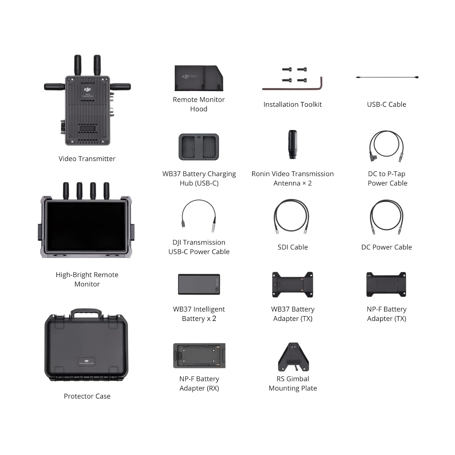 Mounting Hardware ‎DC Power Cable × 1, DC to P-TAP Power Cable × 1, DJI Transmission USB-C Power Cable, High-Bright Remote Monitor × 1, Installation Toolkit × 1, NP-F Battery Adapter (RX) × 1, NP-F Battery Adapter (TX) × 1, Protector Case × 1, RS Gimbal Mounting Plate × 1, Remote Monitor Hood × 1, Ronin Video Transmission Antenna × 2, SDI Cable × 1, USB-C Cable × 1, Video Transmitter × 1, WB37 Battery Adapter (TX) × 1, WB37 Battery Charging Hub (USB-C) × 1, WB37 Intelligent Battery × 2