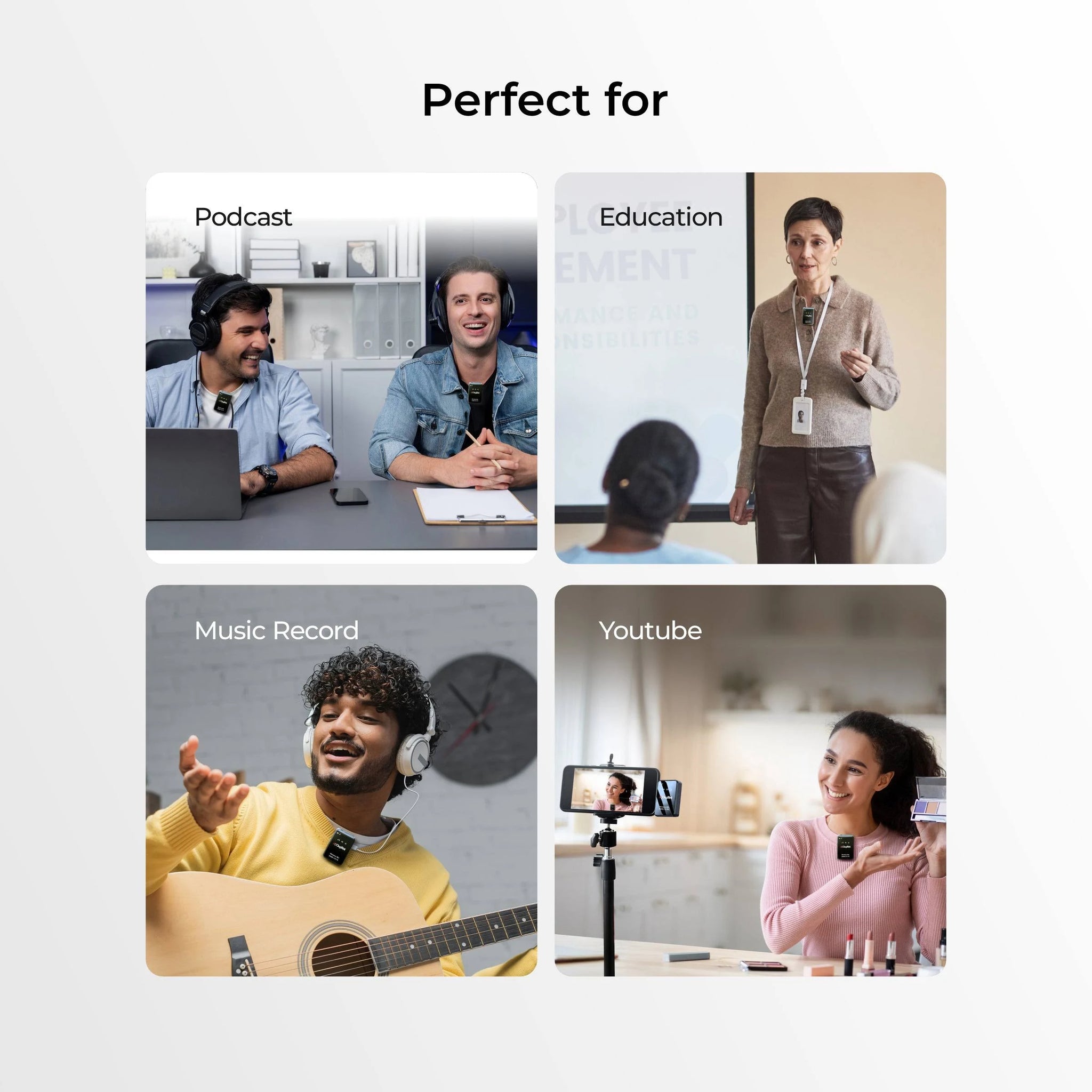 - Versatile Use: Ideal for vlogging, meetings, interviews, podcasts, and video shoots, this wireless microphone system caters to a wide range of applications.