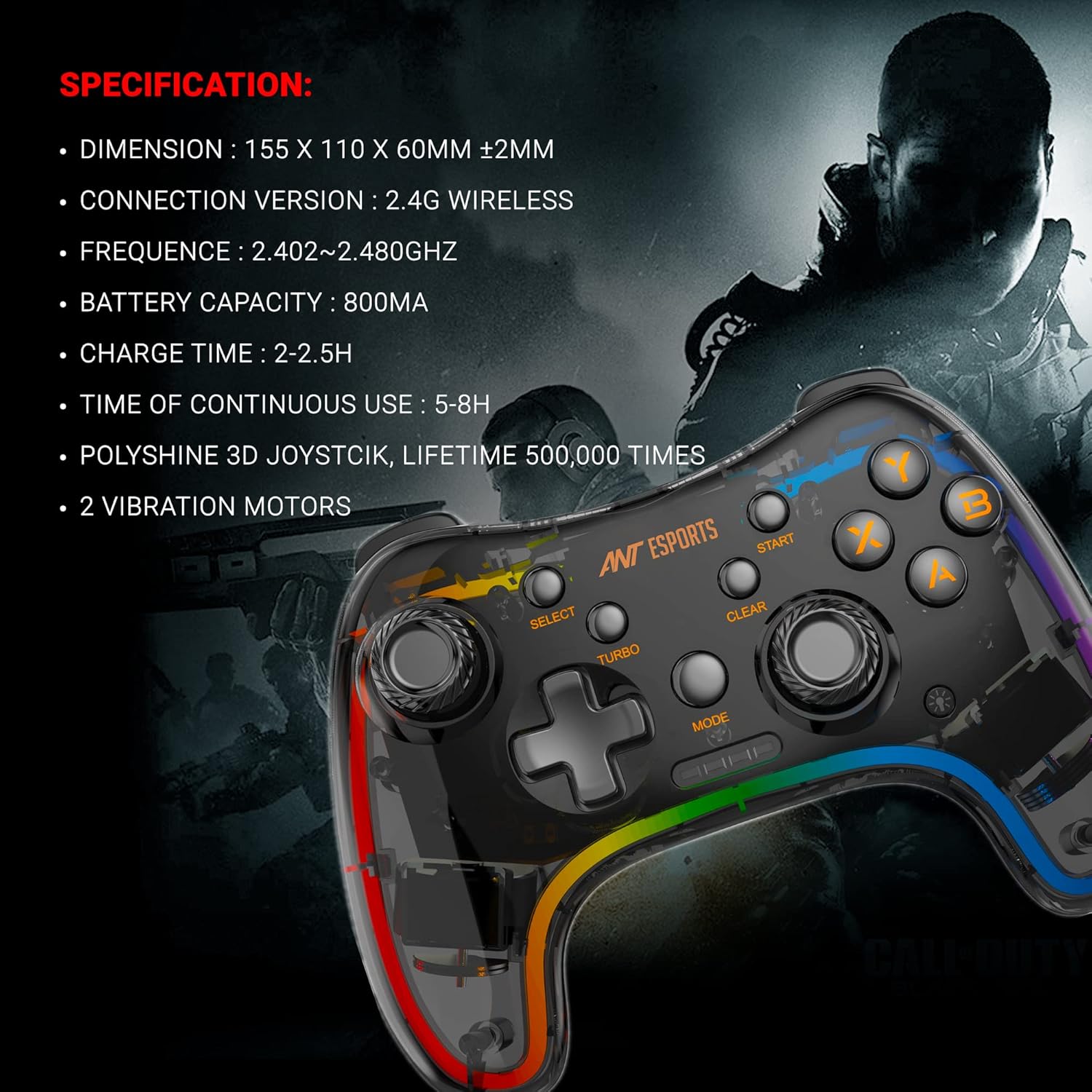 A transparent shell constructed out of premium grade ABS is not only unique but also houses a dual vibrator setup underneath along with joysticks that have great tactile feedback so you not only get to play your games with ease but also live them, thanks to timely and precise feedback to your hands, taking your gaming experience to the next level. A 800 mAH battery will sail you through for 12 hours at a stretch and a universally compatible USB dongle leverages the 2.4Ghz frequency for fast and seamless gaming experience no matter which device or platform you use.