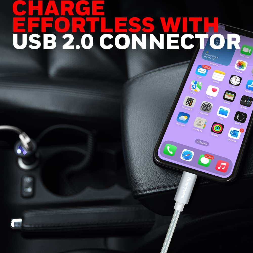 Honeywell USB 2.0 to lightning cable- a reliable choice for Apple device users. It is MFI certified with an original Apple lightning connector for safe charging of iOS devices, supporting up to 2.1A output. This cable ensures swift data transmission at 480Mbps and is built to last, enduring over 10,000 bends and plugging/unplugging actions. Compatible with iPhone 5 and above, its tangle-free design, metallic finish, and tough braiding make it a durable and stylish choice. Backed by a 1-year manufacturer warranty, it is your ideal cable for hassle-free charging and syncing with Apple devices.