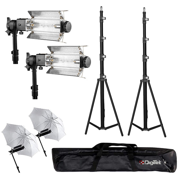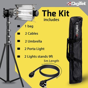 • BOX CONTENTS: TWO Porta Light, TWO Light Stand 14 feet, TWO AC Power Cord 5m length, TWO Umbrella, ONE Kit Carry Bag.