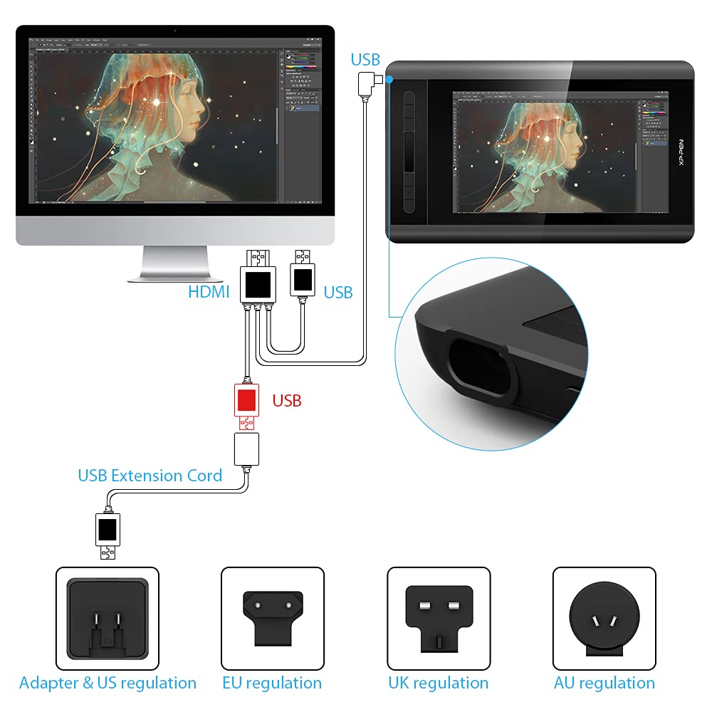 - It includes 11.6 Inch Display tablet, Portable Stand, Battery-free Stylus, 8 Replacement Pen Nibs, Pen Holder, Quick Guide, 3-in-1 USB Cable, Cleaning cloth, USB Extension Cord, Black Drawing Glove and Power Adapter