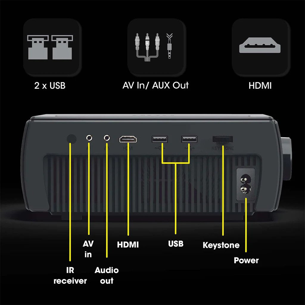 Projector comes with AV IN, AUX OUT, USB x 2, HDMI Built in Speaker