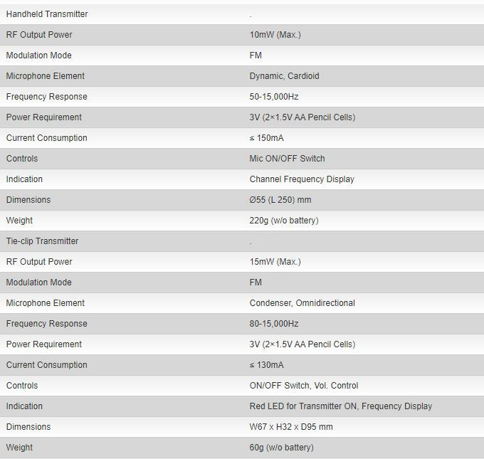 - One handheld dynamic transmitter and one Bodypack transmitter, each operating on 2 × 1.5V AA pencil cells.