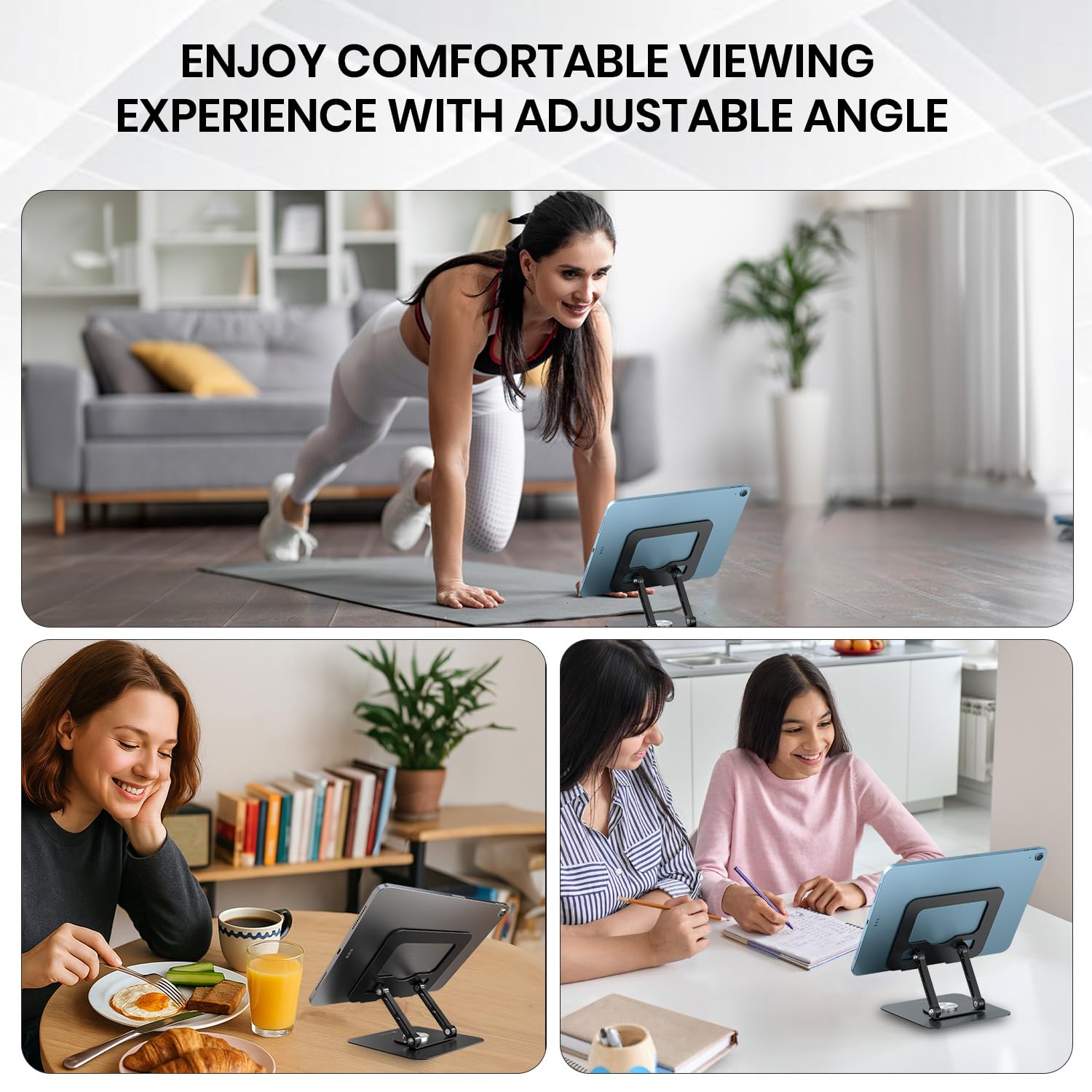 • 360° Rotating Base for Flexible Viewing Easily swivel your tablet to any angle with the smooth 360-degree rotating base. Ideal for video calls, watching content, or collaborative tasks without moving the entire stand.