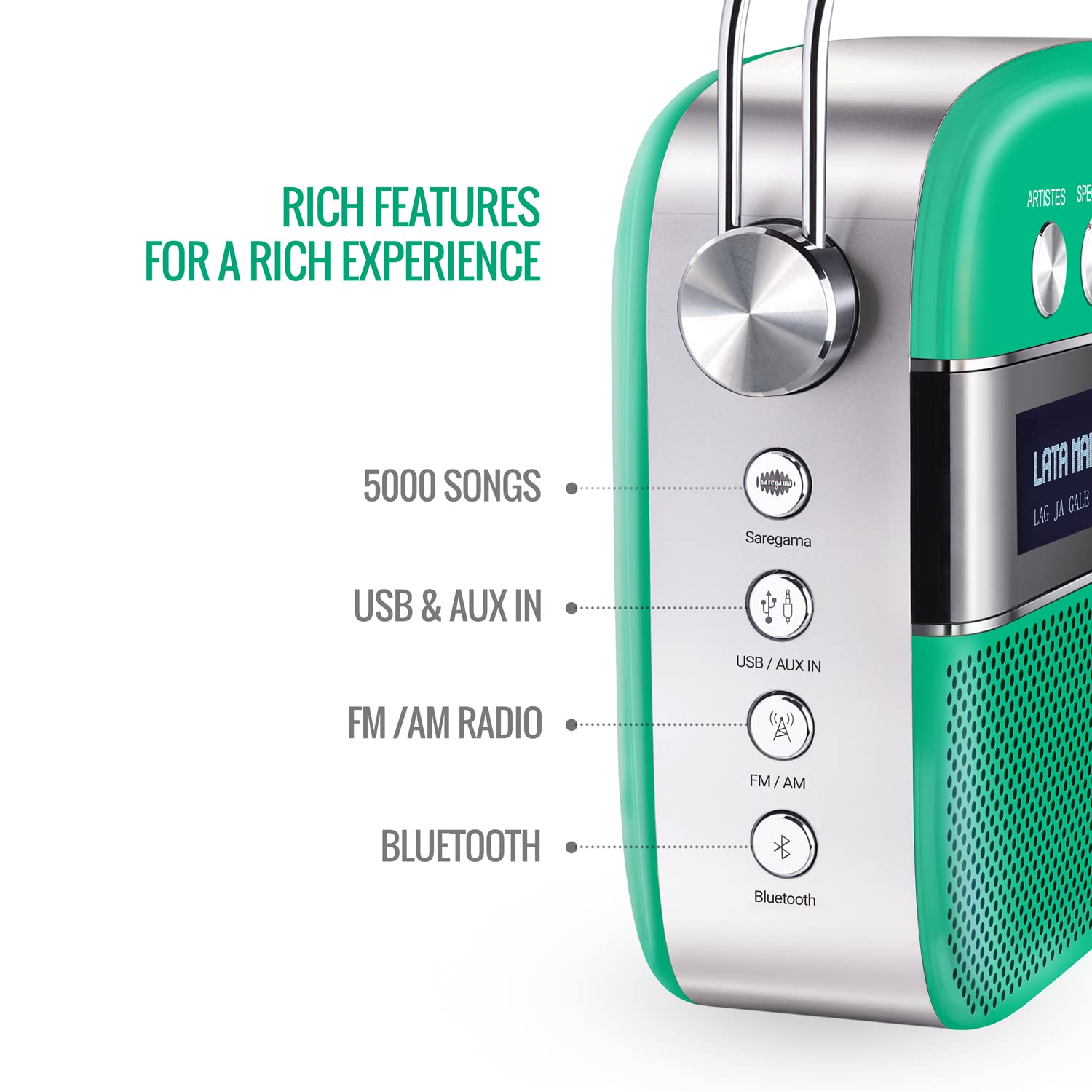 | Model Name | Saregama Carvaan Premium (Pop Colour Range) Hindi - Portable Music Player with 5000 Preloaded Songs, FM/BT/AUX (Forest Green) |