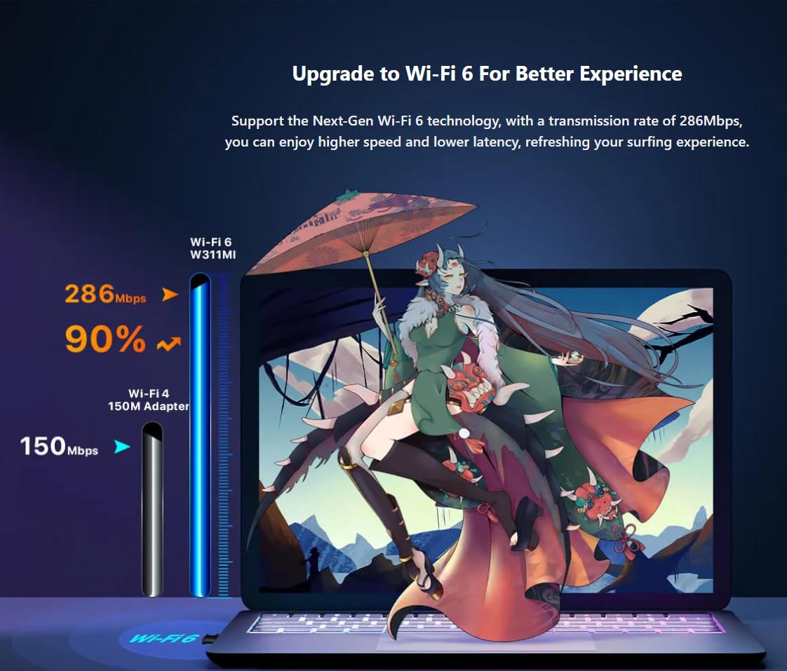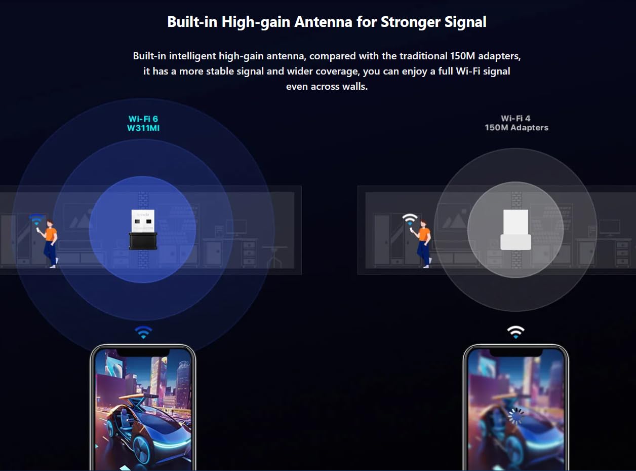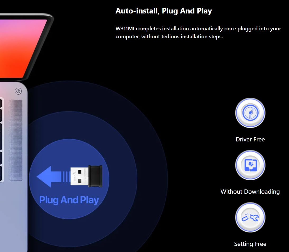 With a mini and portable exterior, the 286 Mbps Wi-Fi 6 driver-free adapter W311MI fits securely into your computer and has no effect on the usage of neighboring ports. It contains an internal driver, which completes installation automatically once plugged into your computer without tedious installation