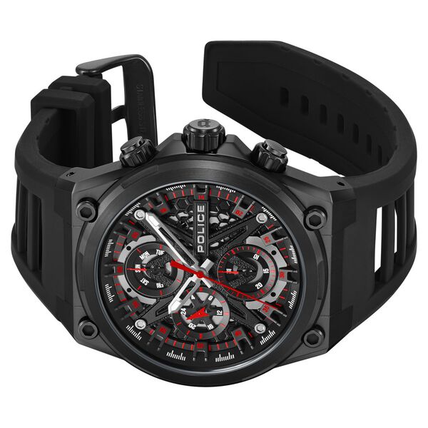 Being bold means infusing your wardrobe with the rebellious personality and dynamic functionality of Police's latest Sonic timepiece. This watch houses a durable multi-movement for superior timekeeping. Sharp in design, all eyes will be drawn to the partial skeleton dial, accentuated by dynamic patterns and bold white & red detailing. Boasting an impressively crafted topring, emphasized by the screw elements, the watch exudes a powerful presence, finished with an easy wear black silicon strap. Own your individuality with Sonic
