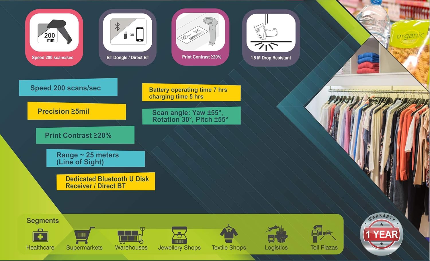 - Scans both 1D and 2D bar codes