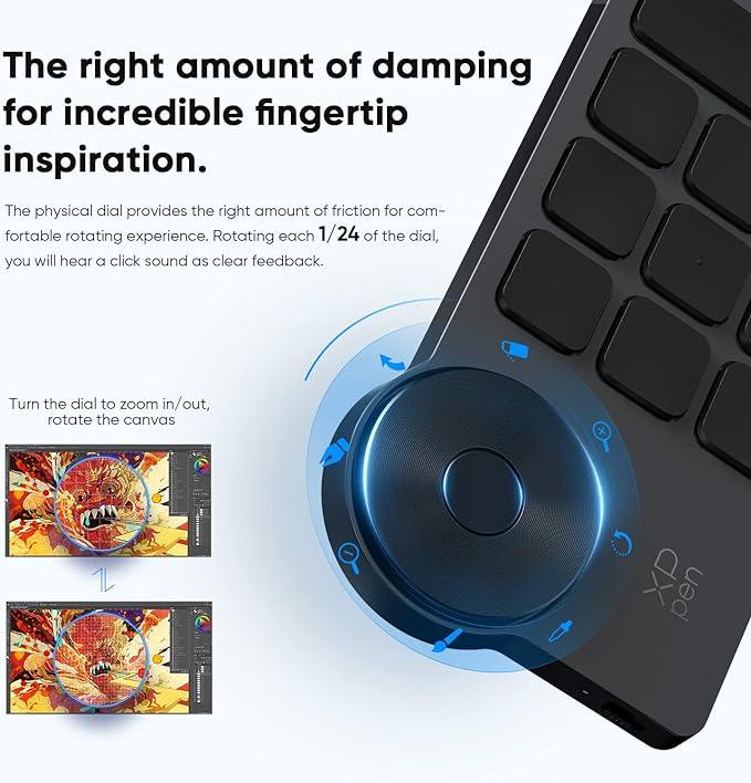 - Convenient Dial Control: Rotating the dial in increments of 1/24 will produce a clear click sound as feedback. You can use the dial to zoom in/out, rotate the canvas, or adjust the brush size, letting your inspiration flow.